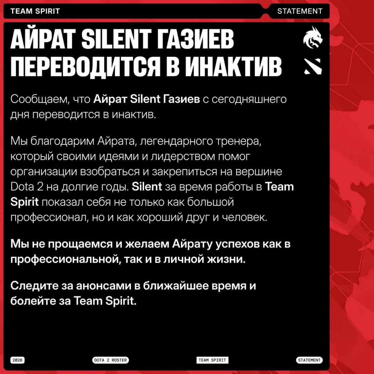 «Мы благодарим Айрата, легендарного тренера, который своими идеями и лидерством помог организации взобраться и закрепиться на вершине Dota 2 на долгие годы», — говорится в анонсе.
