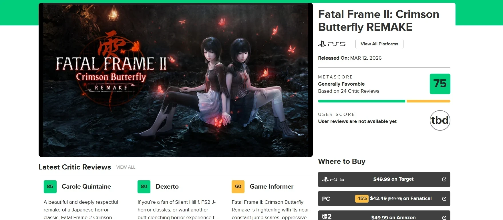 Fatal Frame 2: Crimson Butterfly Remake выходит 12 марта на PC, PS5, Xbox Series и Nintendo Switch 2. Демо игры доступно на всех актуальных платформах с сохранением прогресса.